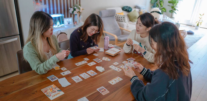 Each player randomly selects a food stall to start with. Each stall has a unique power. If you play a card that matches your stall (e.g., playing Seafood Ramen while owning a ramen stall), you activate its power.