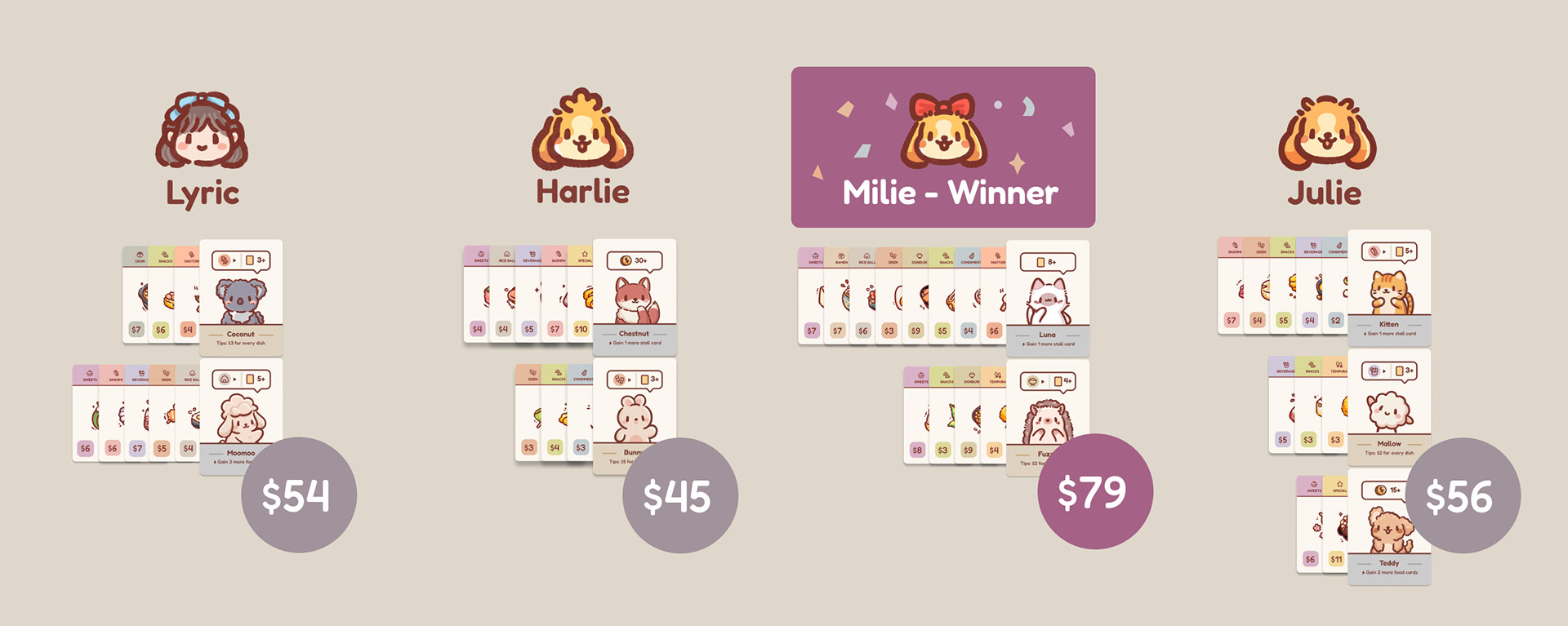 If the food set you create meets the requirements of the guests, you win the guest card and let the guest take over the food set you created for them. Hurry, don’t let your opponents win the guests! Plan wisely to attract the guests to your stall.
